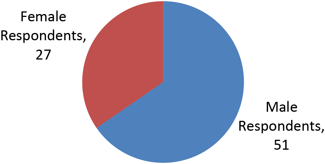 Fig. 1 highlights the fact that a majority of the respondents were male respondents (51) who accounted for 65.4% of the respondents. The figure further reveals that 27 of the total respondents were female respondents who accounted for 34.6% of the total respondents. The data presented in percentages was derived at by calculating the mean percentage of the respondent’s gender distribution. The study used the following formula in the derivation of the mean percentages: (percentage mean: Number of participants ÷ 78 (Total number of respondents) = Mean number of participants × 100 = Percentage Mean).