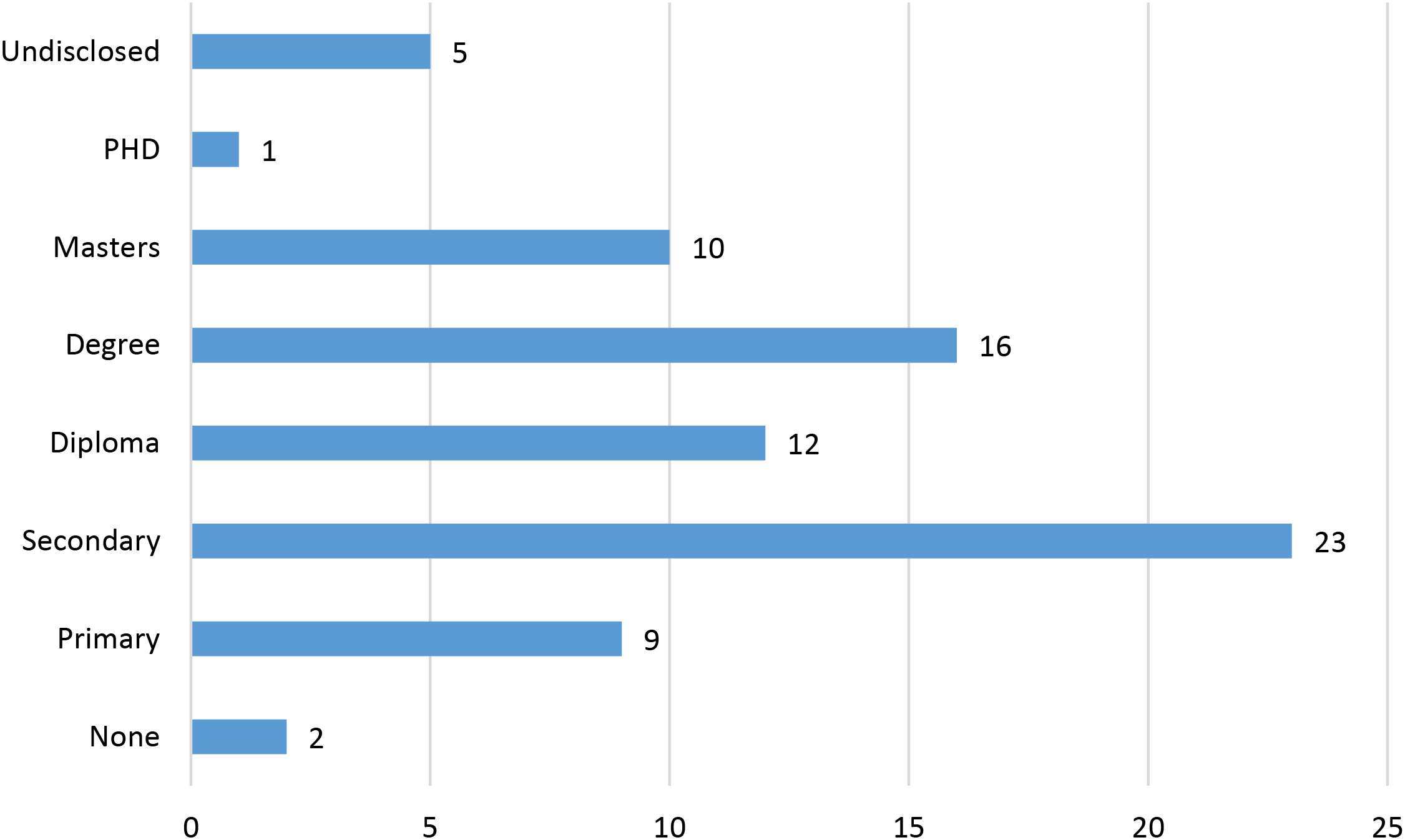 The importance of determining the education level of respondents to assess the credibility of the data collected. It states that respondents with higher education levels are likely to provide more reliable data, enhancing research accuracy. The data reveals that the majority of respondents (23 or 29.5%) had a secondary school education, while the minority (1 or 1.28%) were PhD holders (Fig. 2). Additionally, 5 respondents (6.4%) did not disclose their education level. The percentages were calculated using the formula: (Number of participants ÷ 78) × 100.