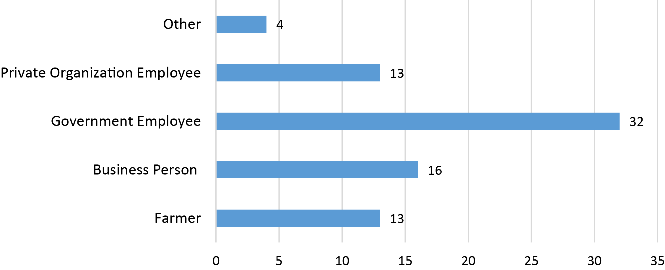Fig. 3 shows that the majority of respondents were government employees (32 individuals), representing 41.0% of the total respondents. In contrast, a minority (4 individuals) selected “other” in the occupation section, accounting for 5.1% of the total. The percentage data was calculated using the formula: (percentage mean: Number of participants ÷ 78 (Total number of respondents) = Mean number of participants × 100 = Percentage Mean).