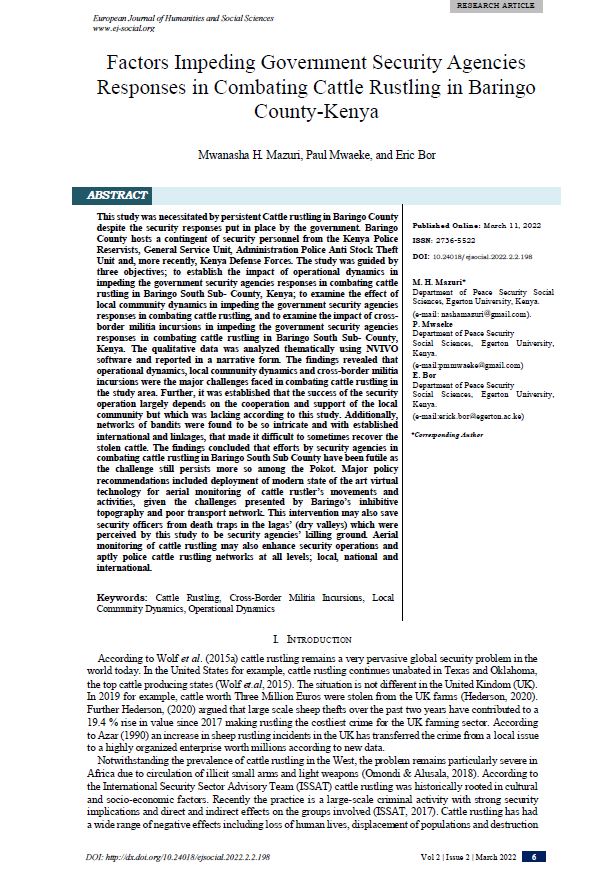 This study was necessitated by persistent Cattle rustling in Baringo County despite the security responses put in place by the government. Baringo County hosts a contingent of security personnel from the Kenya Police Reservists, General Service Unit, Administration Police Anti Stock Theft Unit and, more recently, Kenya Defense Forces. The study was guided by three objectives; to establish the impact of operational dynamics in impeding the government security agencies responses in combating cattle rustling in Baringo South Sub- County, Kenya; to examine the effect of local community dynamics in impeding the government security agencies responses in combating cattle rustling, and to examine the impact of cross-border militia incursions in impeding the government security agencies responses in combating cattle rustling in Baringo South Sub- County, Kenya. The qualitative data was analyzed thematically using NVIVO software and reported in a narrative form. The findings revealed that operational dynamics, local community dynamics and cross-border militia incursions were the major challenges faced in combating cattle rustling in the study area. Further, it was established that the success of the security operation largely depends on the cooperation and support of the local community but which was lacking according to this study. Additionally, networks of bandits were found to be so intricate and with established international and linkages, that made it difficult to sometimes recover the stolen cattle. The findings concluded that efforts by security agencies in combating cattle rustling in Baringo South Sub County have been futile as the challenge still persists more so among the Pokot. Major policy recommendations included deployment of modern state of the art virtual technology for aerial monitoring of cattle rustler’s movements and activities, given the challenges presented by Baringo’s inhibitive topography and poor transport network. This intervention may also save security officers from death traps in the lagas’ (dry valleys) which were perceived by this study to be security agencies’ killing ground. Aerial monitoring of cattle rustling may also enhance security operations and aptly police cattle rustling networks at all levels; local, national and international.