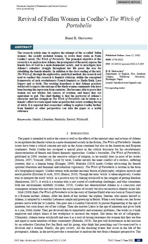 The research article aims to explore the attempt of the so-called ‘fallen women’, the socially excluded women, to revive their status in Paulo Coelho’s novel, The Witch of Portobello. The principal objective of this research is to analyze how Athena, the protagonist of the novel, exposes the female face of God in a male-dominated society, and to investigate how Athena’s relentless struggle throughout her life paves the way for rebuilding the female identity. In addition to the close reading of the text, The Witch of, through the explorative, analytical method, the research tool used to conduct this research is feminist criticism, within the conceptual frameworks of such revolutionary French feminists as Sheila Ruth, Luce Irigary and so forth. The working hypothesis is that Athena practices witchcraft to express the outrage of the whole women community who have been bearing the repression from centuries. She becomes able to prove that women are not witches but sources of creation, and hence they are equivalent to god. The chief finding is that the portrayal of Athena’s character and her struggle in The Witch of Portobello can be taken as a female’s effort to create equal status in patriarchal society avoiding the tag of witch. It is expected that researchers willing to explore Coelho further from feminist or other perspectives can take the paper as a useful reference.