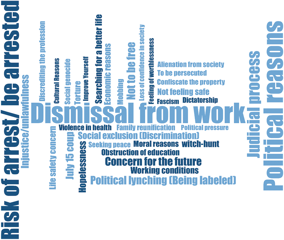 Results: A total of 506 responses were analyzed. The mean age of the participants was 39.9 ± 8.8 years (54.2% men, 77.5% medical doctors). Almost all participants reported that the political atmosphere in Turkey forced them to migrate. Some participants were unable to do their jobs due to the increasing violence in the health system in recent years. Most participants saw migration as the only way out, as they did not feel free and safe. Comparatively, they were in a better economic situation in Turkey and had a higher standard of living.