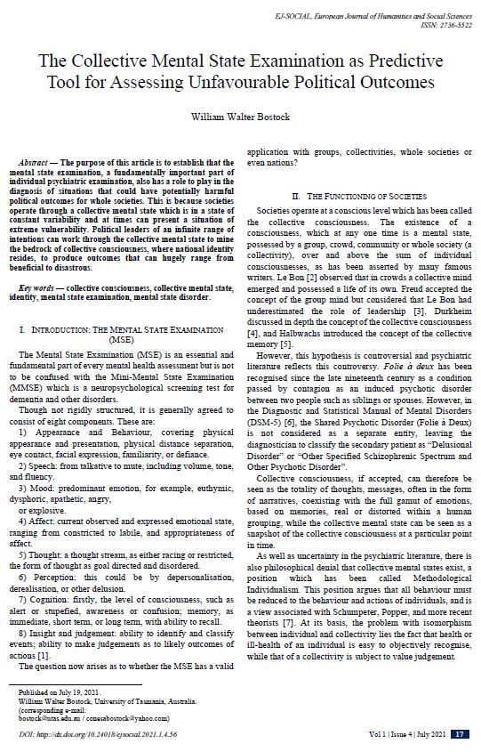 The purpose of this article is to establish that the mental state examination, a fundamentally important part of individual psychiatric examination, also has a role to play in the diagnosis of situations that could have potentially harmful political outcomes for whole societies. This is because societies operate through a collective mental state which is in a state of constant variability and at times can present a situation of extreme vulnerability. Political leaders of an infinite range of intentions can work through the collective mental state to mine the bedrock of collective consciousness, where national identity resides, to produce outcomes that can hugely range from beneficial to disastrous.