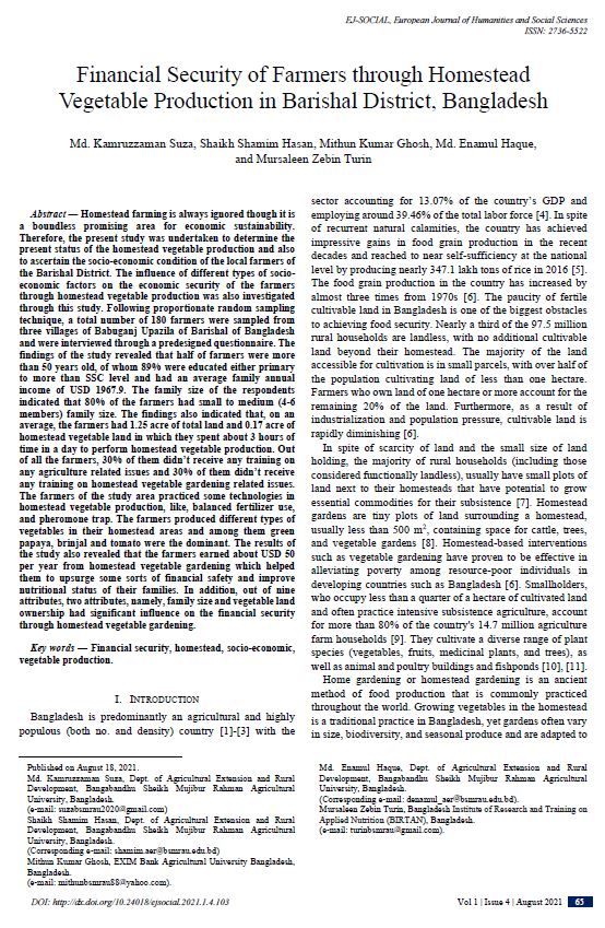 Financial Security of Farmers through Homestead Vegetable Production in Barishal District, Bangladesh