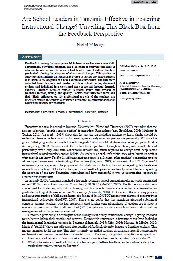 Are School Leaders in Tanzania Effective in Fostering Instructional Change? Unveiling This Black Box from the Feedback Perspective