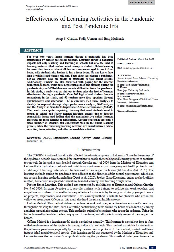 Effectiveness of Learning Activities in the Pandemic and Post Pandemic Era