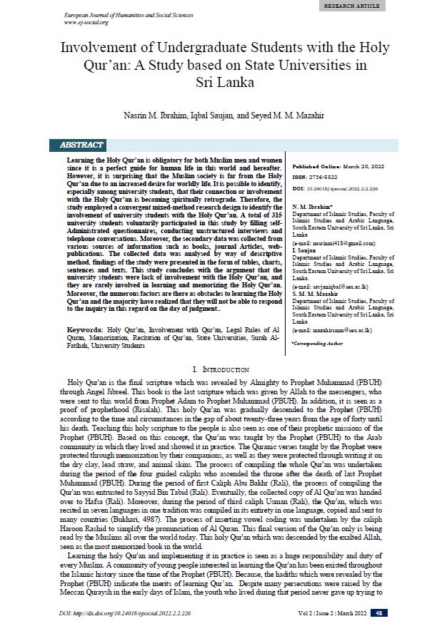 Involvement of Undergraduate Students with the Holy Qur’an: A Study based on State Universities in Sri Lanka