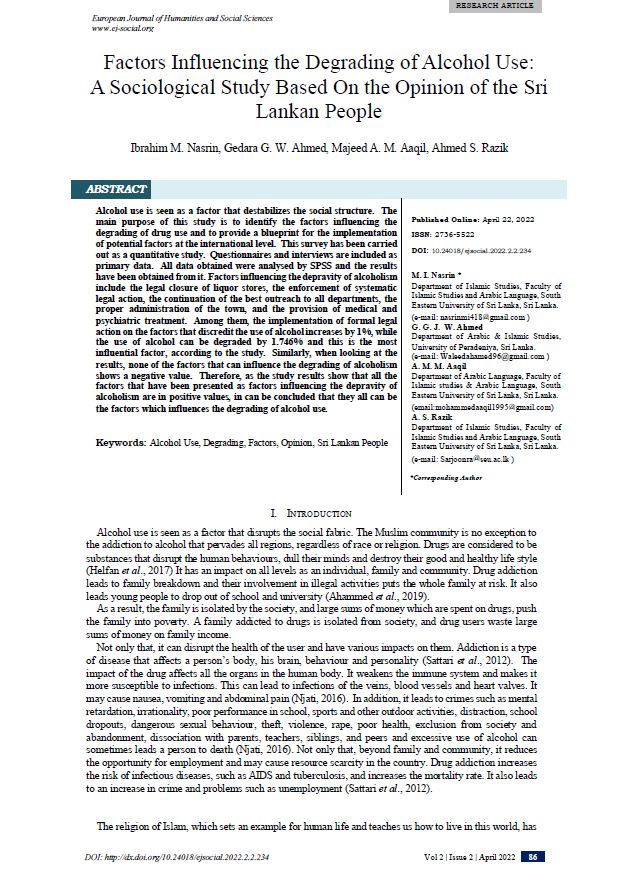 Factors Influencing the Degrading of Alcohol Use: A Sociological Study Based On the Opinion of the Sri Lankan People