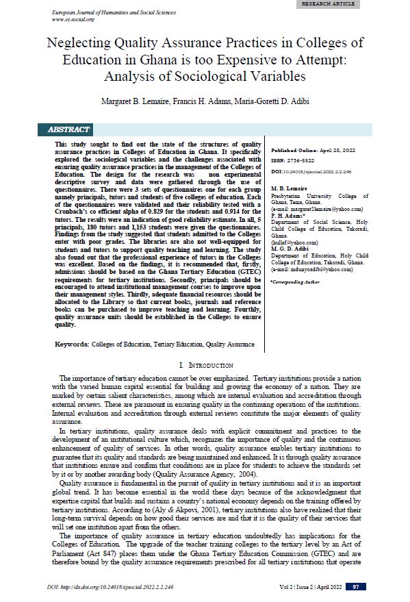 Neglecting Quality Assurance Practices in Colleges of Education in Ghana is too Expensive to Attempt: Analysis of Sociological Variables