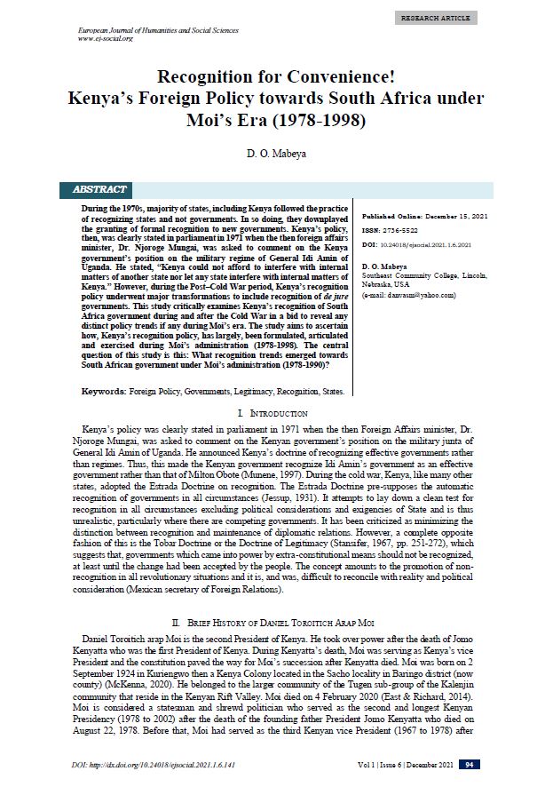 Recognition for Convenience! Kenya’s Foreign Policy towards South Africa under Moi’s Era (1978-1998)