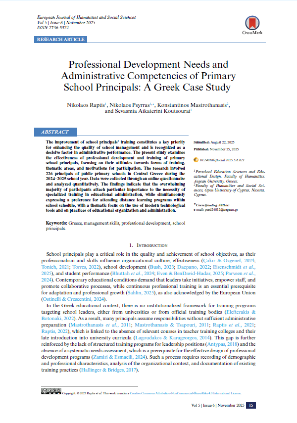 Professional Development Needs and Administrative Competencies of Primary School Principals: A Greek Case Study